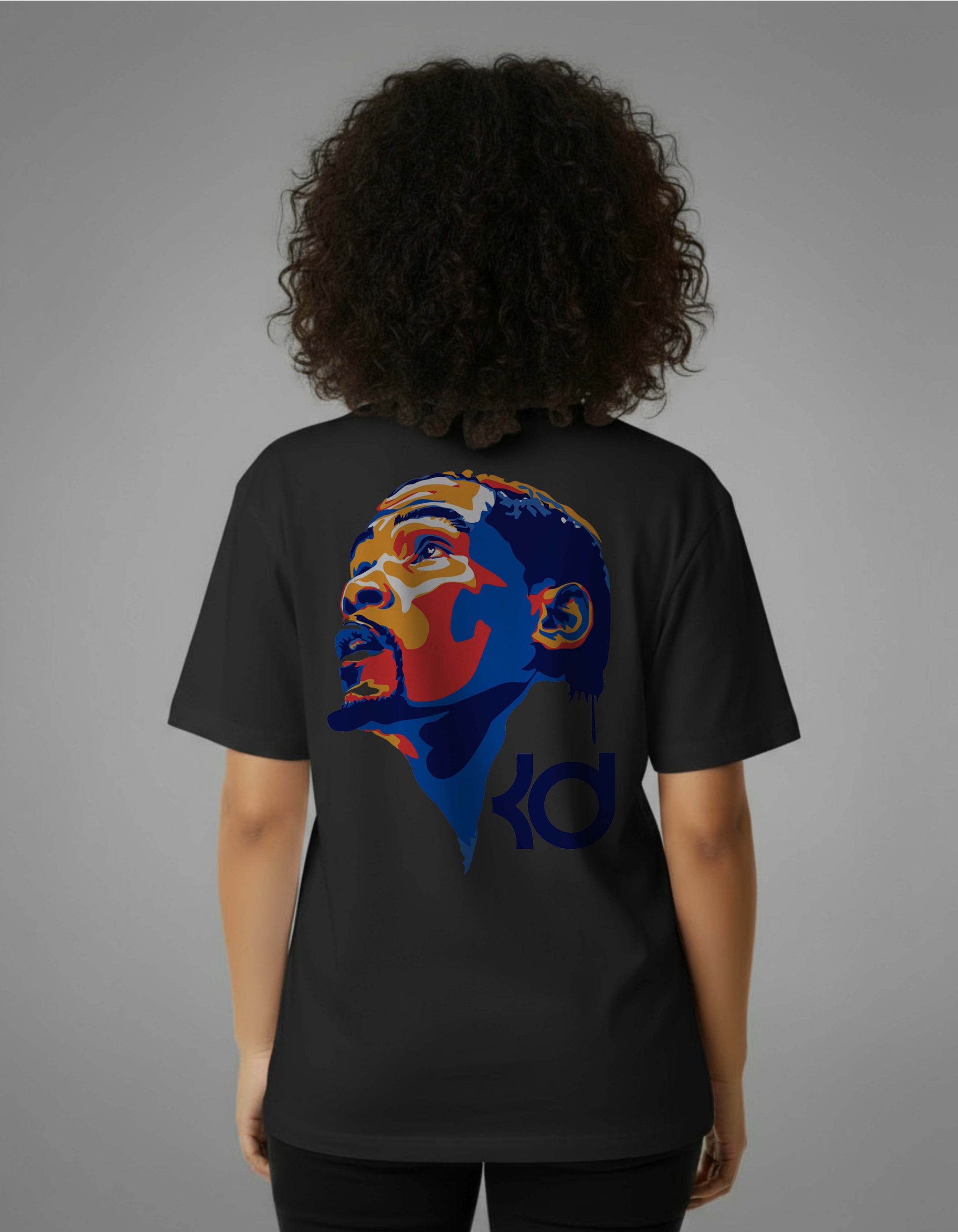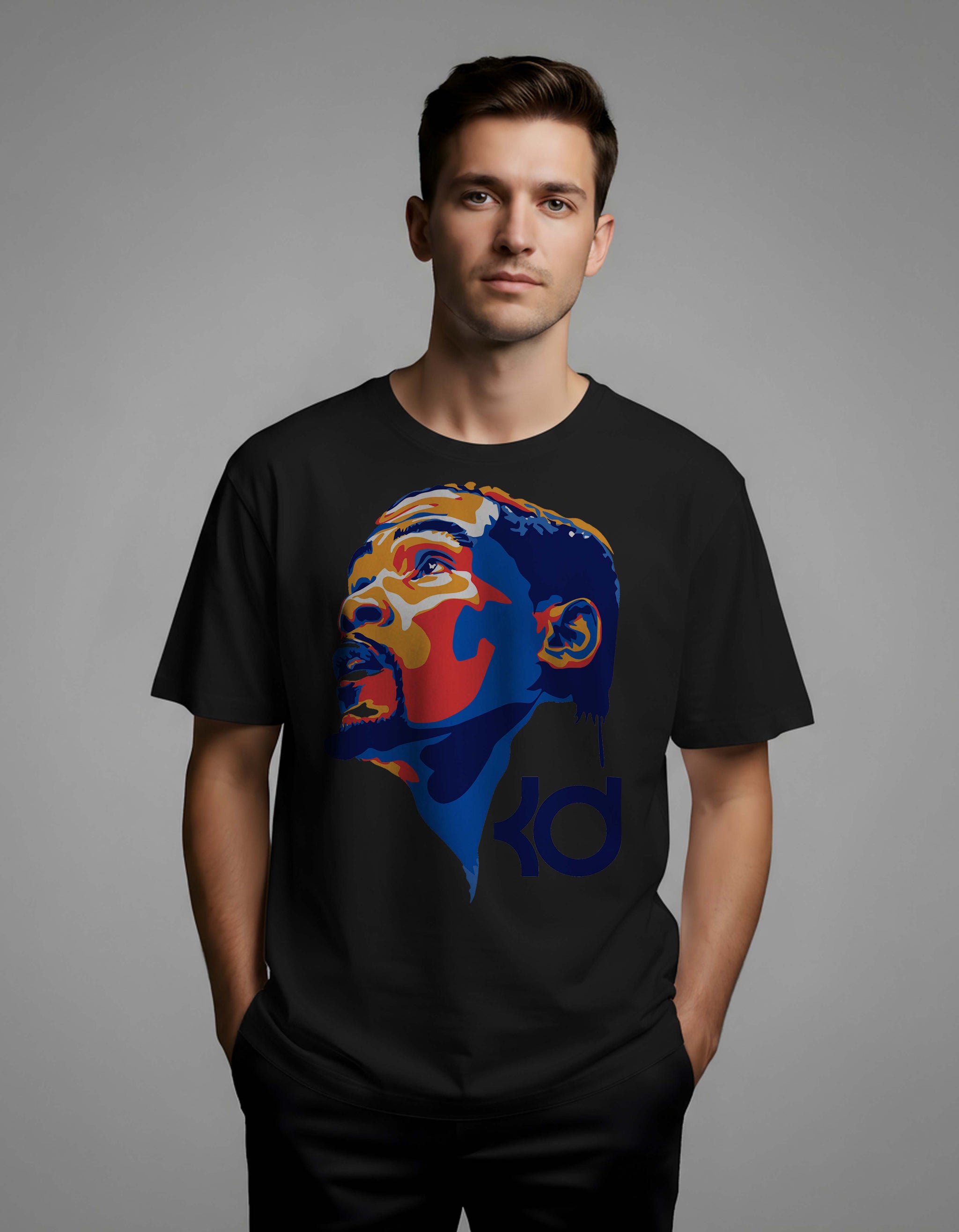Embrace the calm killer energy with the Kevin Durant “KD Legacy” Graphic Tee. Featuring a vibrant pop-art portrait in striking blue, orange, and red tones, this tee captures KD’s precision, confidence, and dominance — on and off the hardwood.