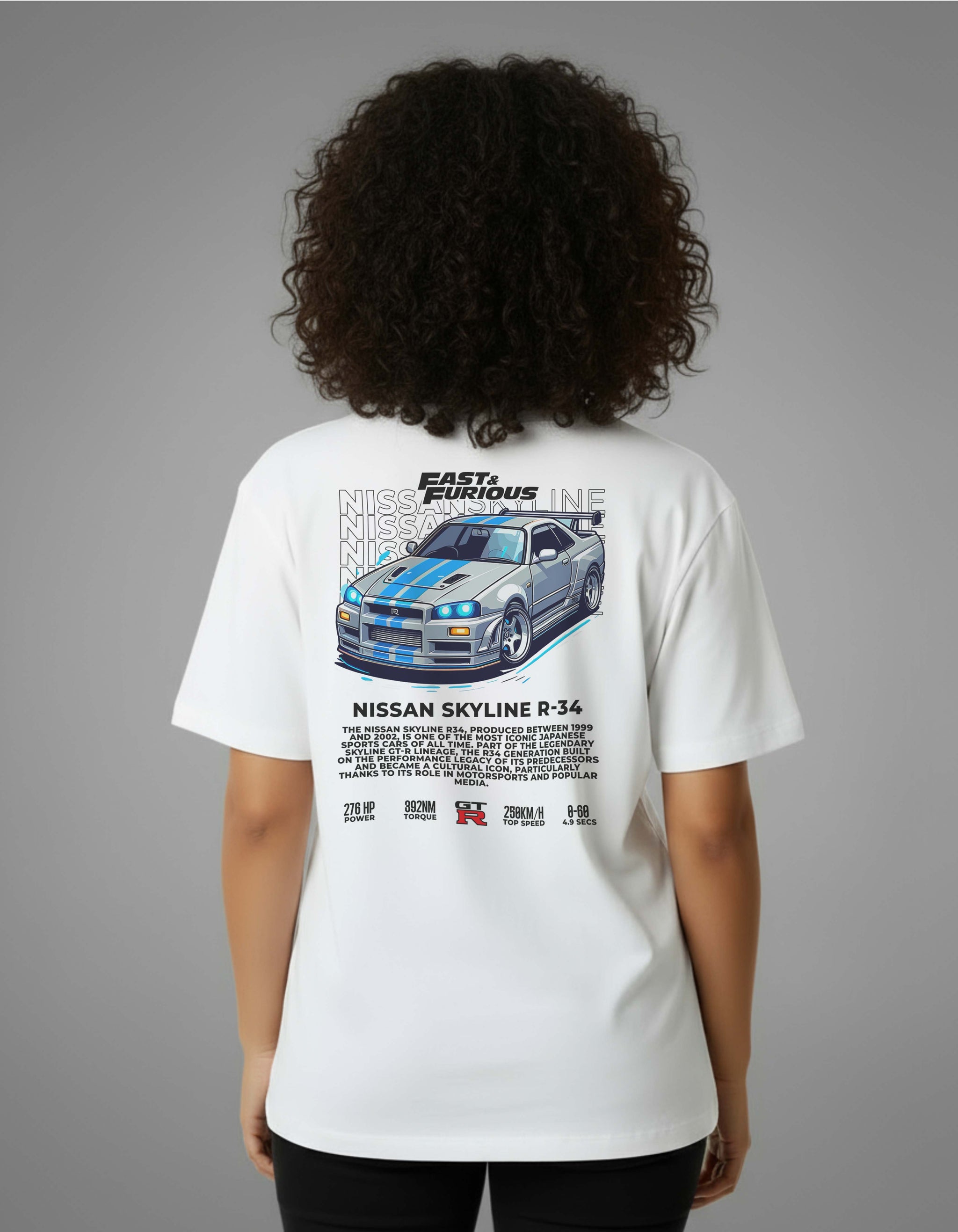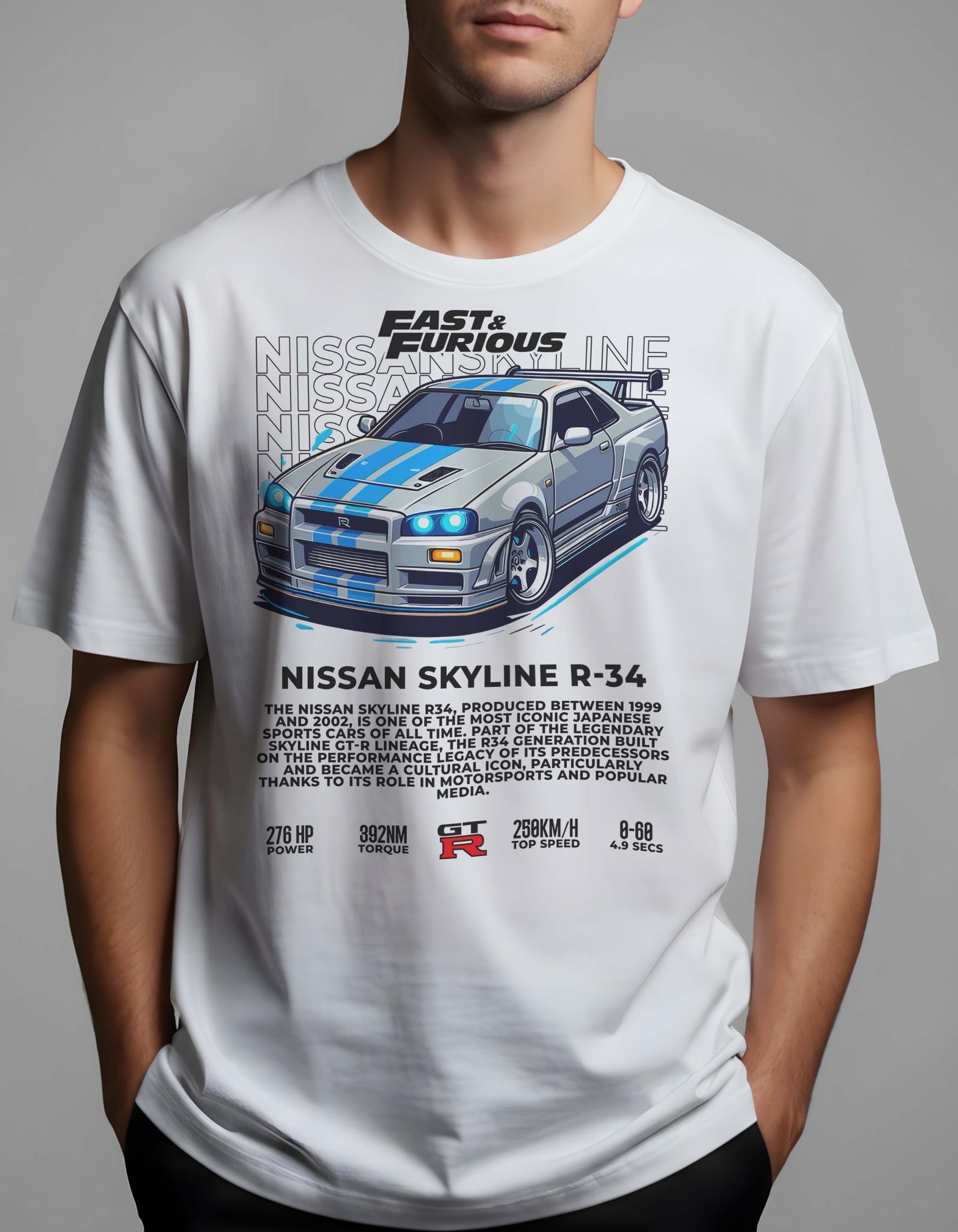 The “R34 – Rear Legend” Tee pays homage to one of Japan’s most revered machines — the Nissan Skyline R34 GT-R. Featuring a detailed rear-view illustration, this design captures every detail that made the R34 a global icon — from the twin circular tail lights to the signature “R” badge that defined a generation.