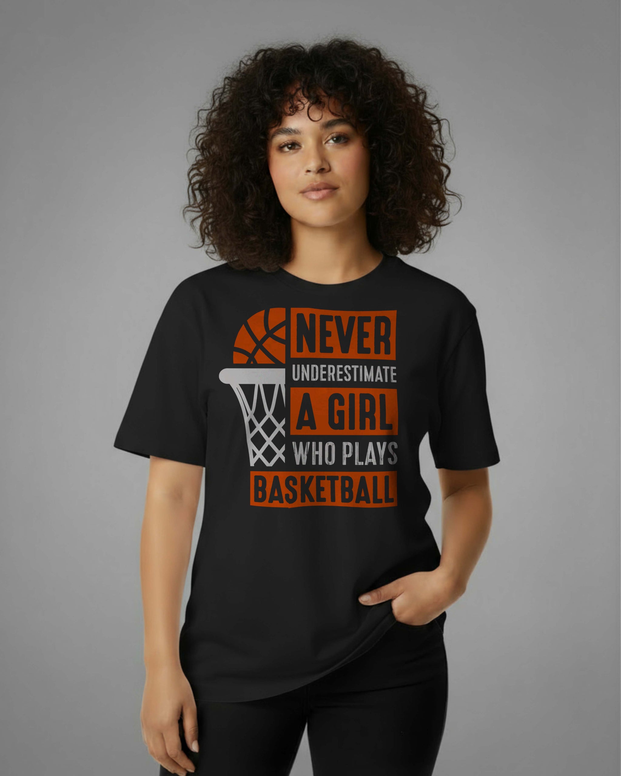 This design celebrates fearless female ballers who break barriers and dominate the court. The bold orange-and-white layout with a hoop graphic brings confidence, passion, and pride together in one statement piece.