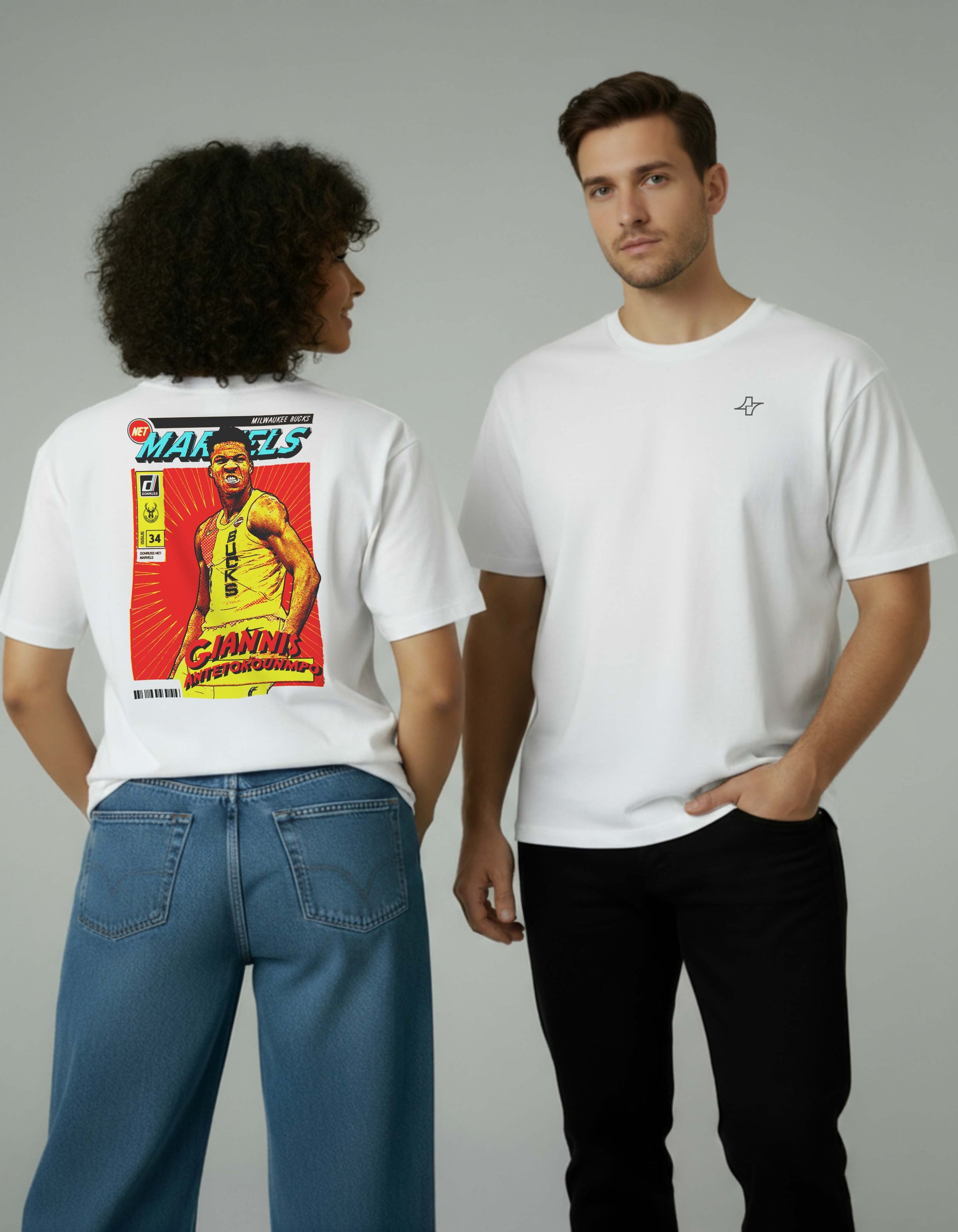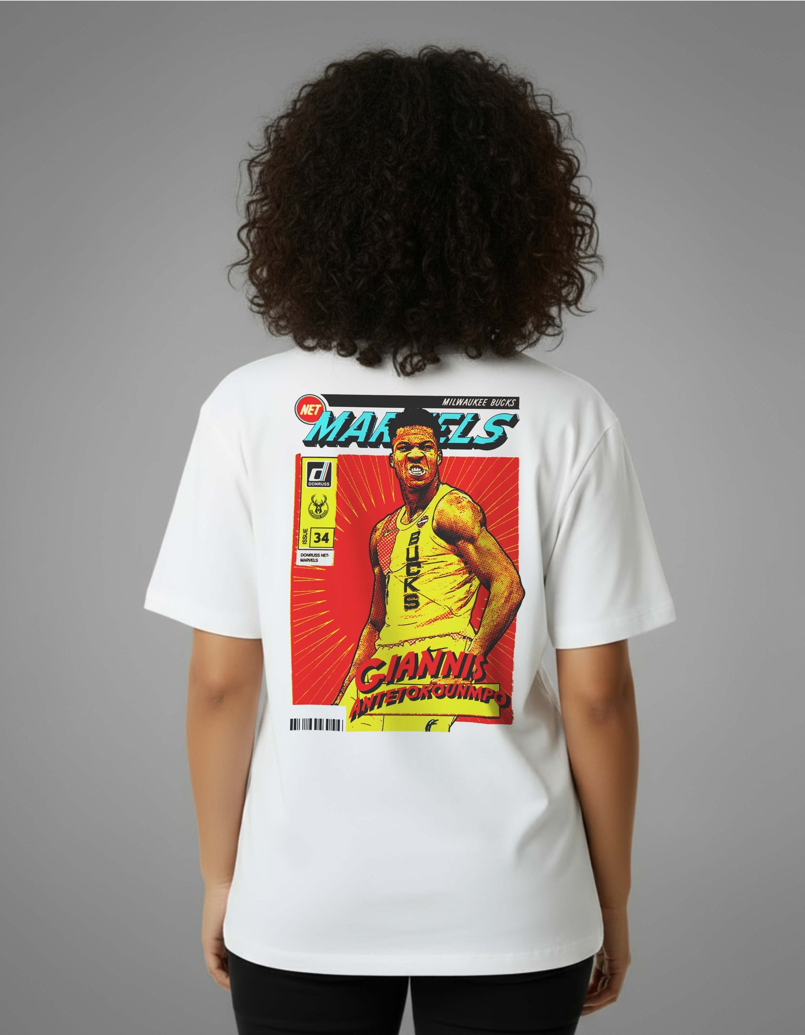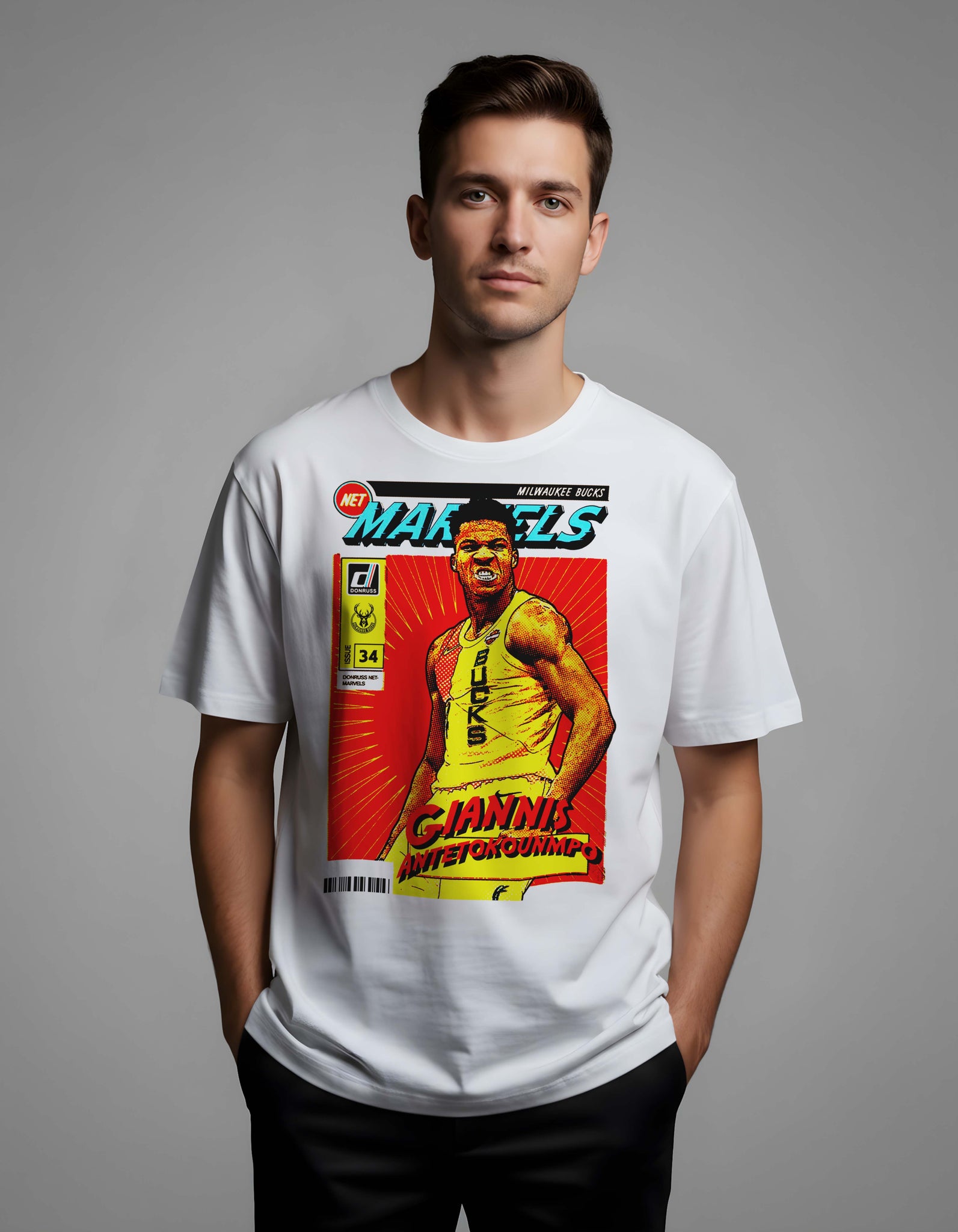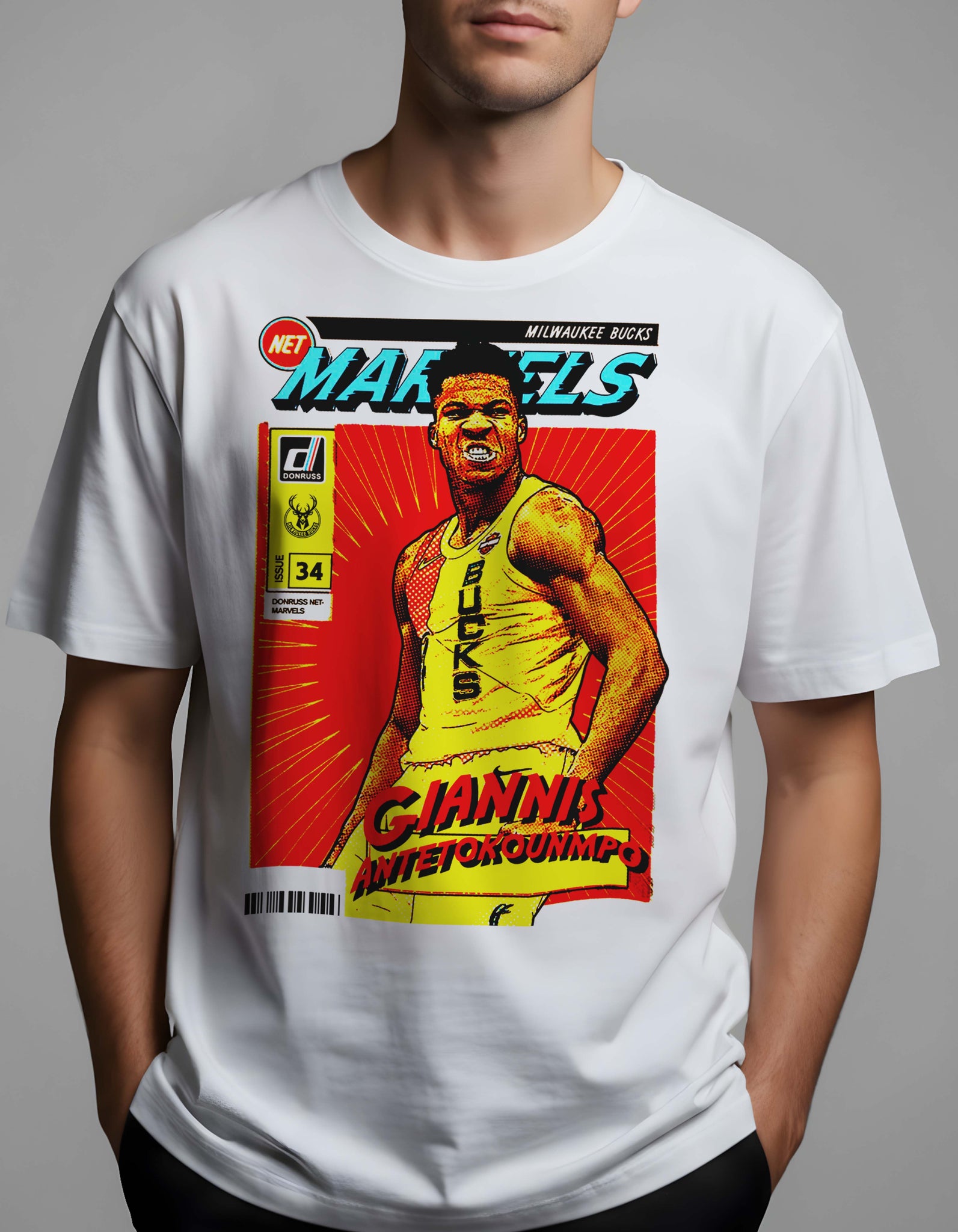 Step into superhero mode with the Giannis Antetokounmpo “Net Marvels” Graphic Tee. Styled like a vintage comic book cover, this tee celebrates Giannis’ unstoppable power, passion, and larger-than-life presence on and off the court.